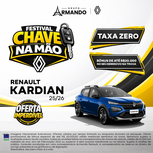 Imagens meramente ilustrativas. Ofertas válidas por tempo limitado ou enquanto durarem os estoques. Oferta de bônus de até R$ 20.000,00 mediante seminovo na troca. Seminovo sujeito a avaliação prévia, laudo cautelar, todas as revisões feitas na concessionária da marca do veículo, média de 10.000 km rodados ao ano, ano de fabricação 2022 ou superior e sem avarias mecânicas ou na lataria. Sujeito à análise de crédito. Consulte demais condições em uma concessionária Armando Renault. A concessionária se reserva ao direito de corrigir possíveis erros gráficos ou de digitação. No trânsito, enxergar o outro salva vidas.