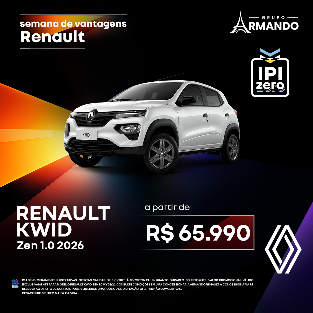 Imagens meramente ilustrativas. Ofertas válidas por tempo limitado ou enquanto durarem os estoques. Valor promocional válido exclusivamente para modelo Renault Kwid Zen 1.0 25/26. Consulte condições em uma concessionária Armando Renault. A concessionária se reserva ao direito de corrigir possíveis erros gráficos ou de digitação. Desacelere. Seu bem maior é a vida.