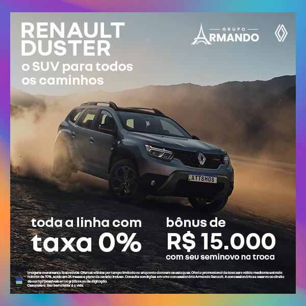 Oferta válida de 03/10/2025 a 04/11/2025 para o modelo Renault Duster intense Plus 1.6 MT, ano/modelo 25/26, na pintura sólida preta, por tempo limitado ou enquanto durarem os estoques. Consulte condições para taxa zero e bônus em uma concessionária Armando Renault. A concessionária se reserva ao direito de corrigir possíveis erros gráficos ou de digitação. Desacelere. Seu bem maior é a vida.