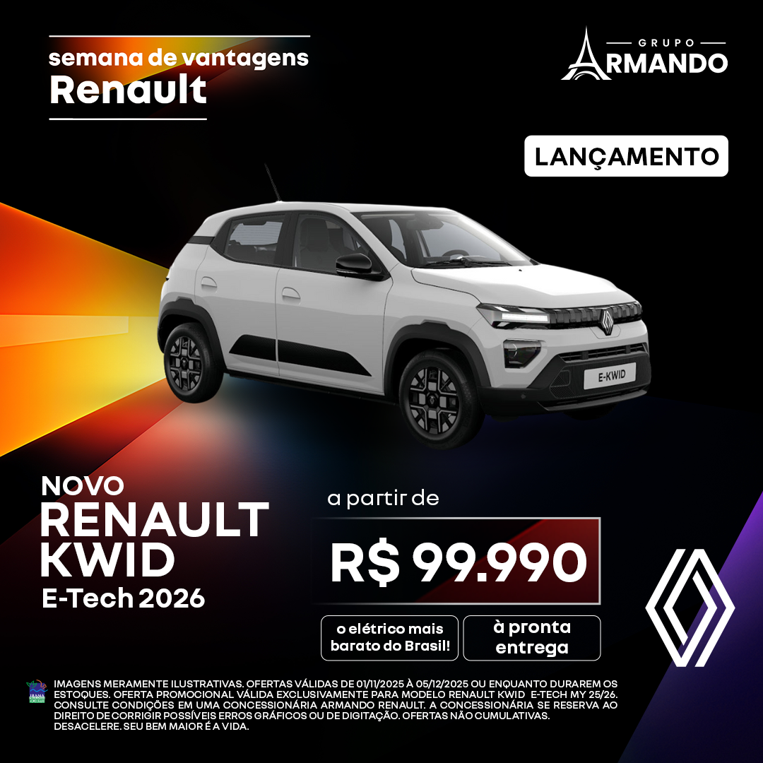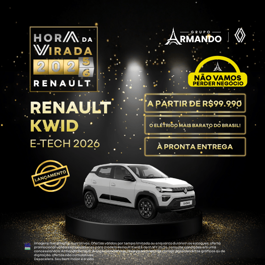 Imagens meramente ilustrativas. Oferta válida para o modelo Renault Kwid E-Tech 25/25, por tempo limitado ou enquanto durarem os estoques. Consulte condições em uma concessionária Armando Renault. A concessionária se reserva ao direito de corrigir possíveis erros gráficos ou de digitação. Desacelere. Seu bem maior é a vida.