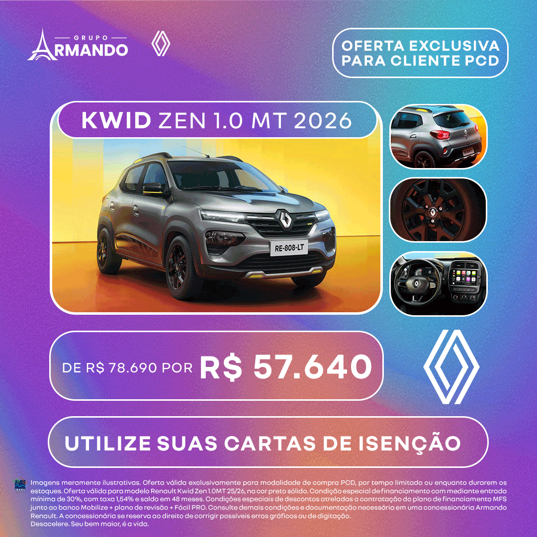 Imagens meramente ilustrativas. Oferta válida exclusivamente para modalidade de compra PCD, por tempo limitado ou enquanto durarem os estoques. Oferta válida para modelo Renault Kwid Zen 1.0MT 25/26, na cor preto sólido. Condição especial de financiamento com mediante entrada mínima de 30%, com taxa 1,54% e saldo em 48 meses. Condições especiais de descontos atreladas a contratação do plano de financiamento MFS junto ao banco Mobilize + plano de revisão + Fácil PRO. Consulte demais condições e documentação necessária em uma concessionária Armando Renault. A concessionária se reserva ao direito de corrigir possíveis erros gráficos ou de digitação. Desacelere. Seu bem maior, é a vida.